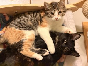 Maizie (tortie) and Taffy (aka Kyle) came to the shelter as very timid, nearly feral kittens. They went into a foster home where they stayed...
