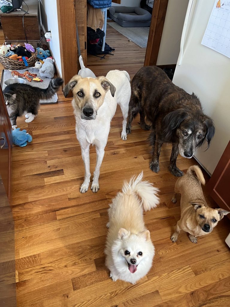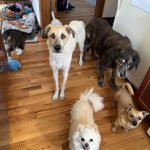 This ball of joy is around 6 years old. She seems to do well with everyone she meets; she has loved every person and dog that she’s been introduced to.