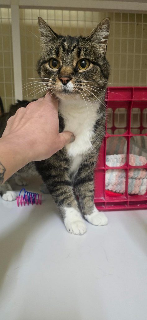 Mittens arrived to GVAWL as a stray, so we do not have a lot of information on her. We believe she is about 2 years old and due to being left out in the for a few weeks, she is prone to overeating so she will need an adopter that can stay strong and not give in those gorgeous begging for third meal eyes. Mittens is very friendly and is happy to cuddle or follow you around as you work. She just wants to be near you