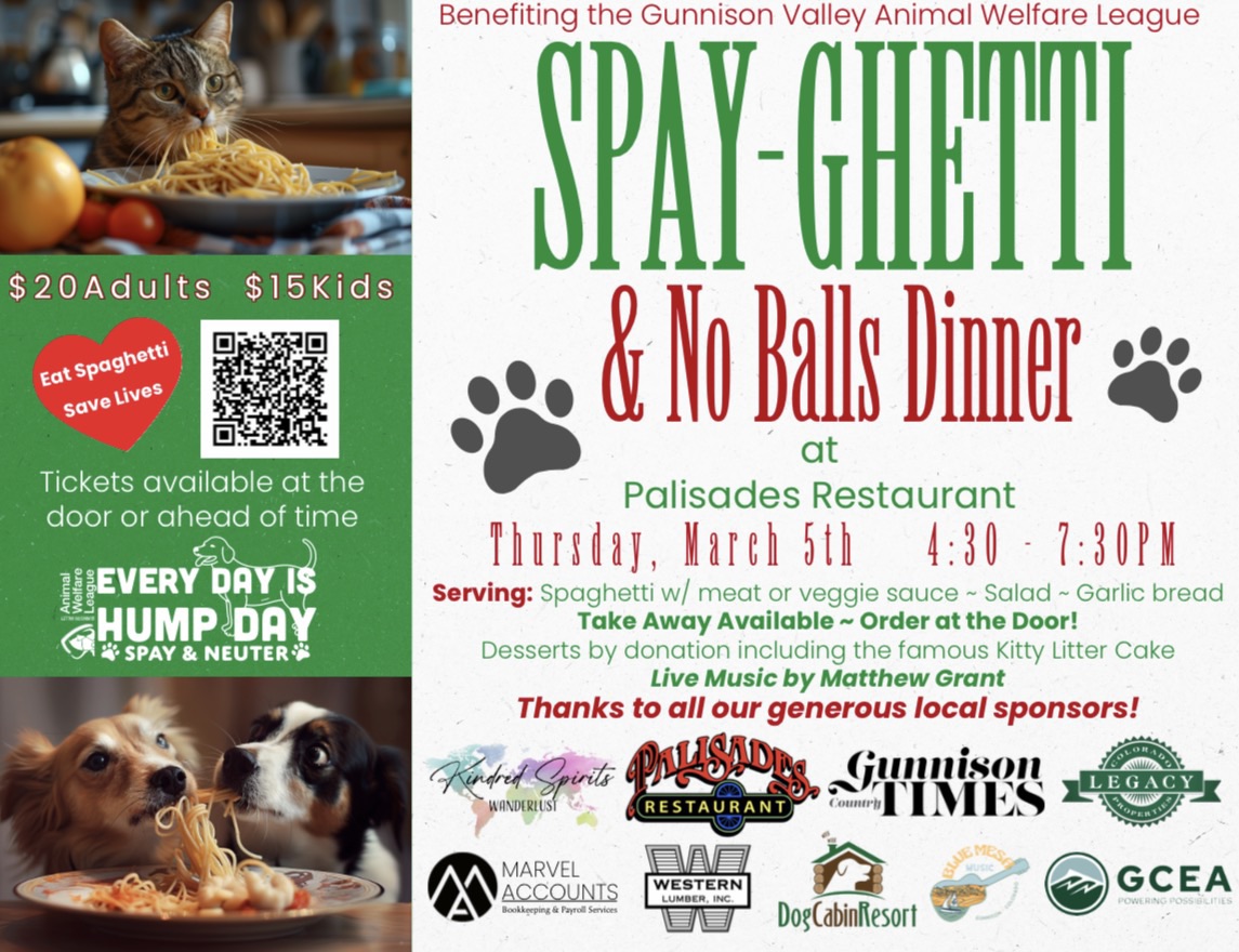 One of our biggest hits, the Annual Spayghetti and No Balls Dinner, is just around the corner! Join us Thursday, March 5th between 4:30PM and 7:30PM at Palisades Restaurant at 802 N. Main Street in Gunnison.  Tickets can be purchased in advance through Zeffy or at the day with cash, check, or Zeffy (credit card).